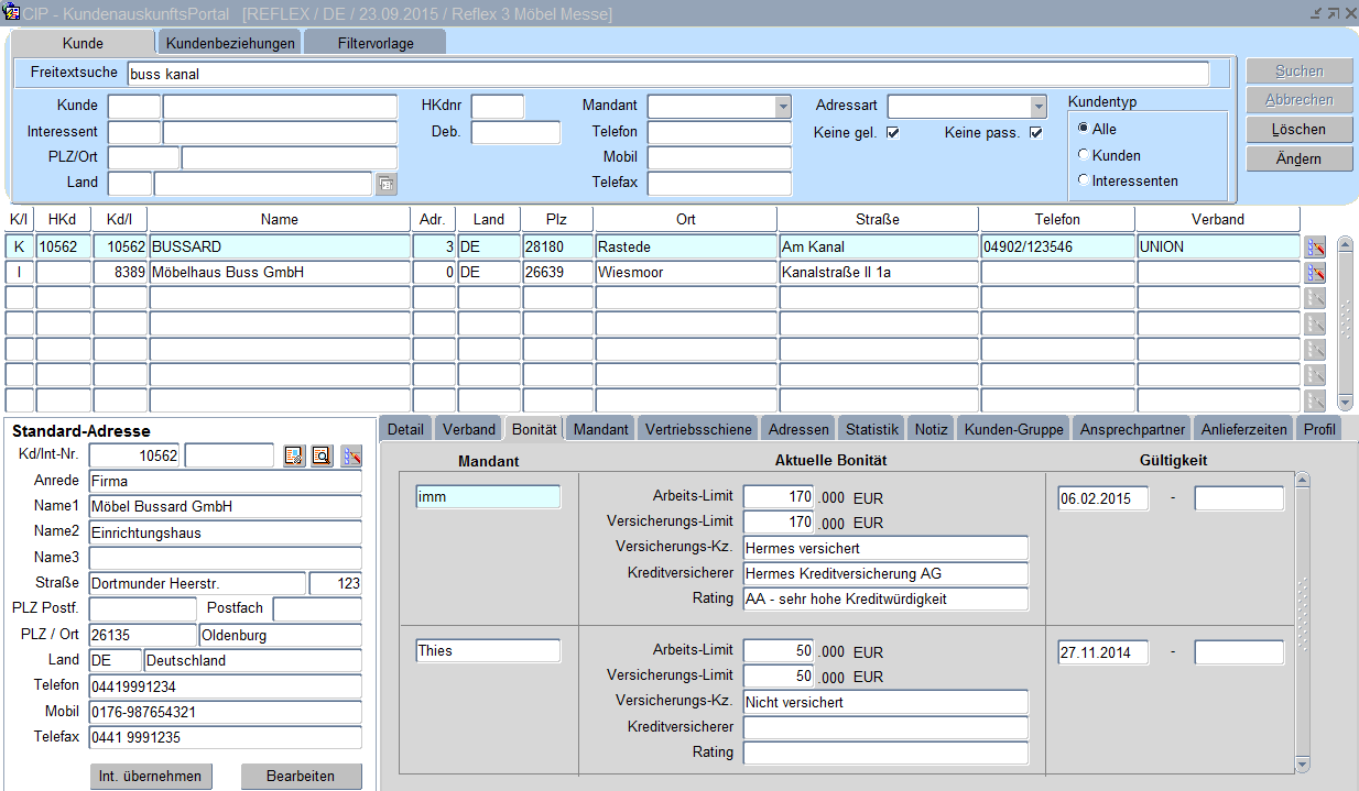 Die Versicherungs- und Arbeitslimitdaten werden in dieser Maske aufgeführt. Über den Button "Bearbeiten" ist der Wechsel in die entsprechenden Kunden- und Interessenten-Stammdaten zum Bearbeiten möglich.