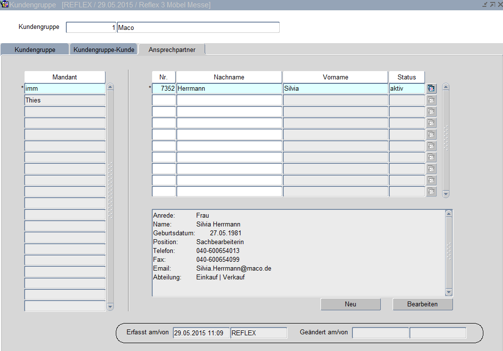 In dieser Maske werden die Ansprechpartner zur Kundengruppe angezeigt und verwaltet. Mit dem Button „Neu" können weitere Ansprechpartner angelegt bzw. mit dem Button „Bearbeiten „ bestehende Datensätze verändert oder gelöscht werden. Hier besteht auch die Möglichkeit, Notizen zu der jeweiligen Person zu speichern.