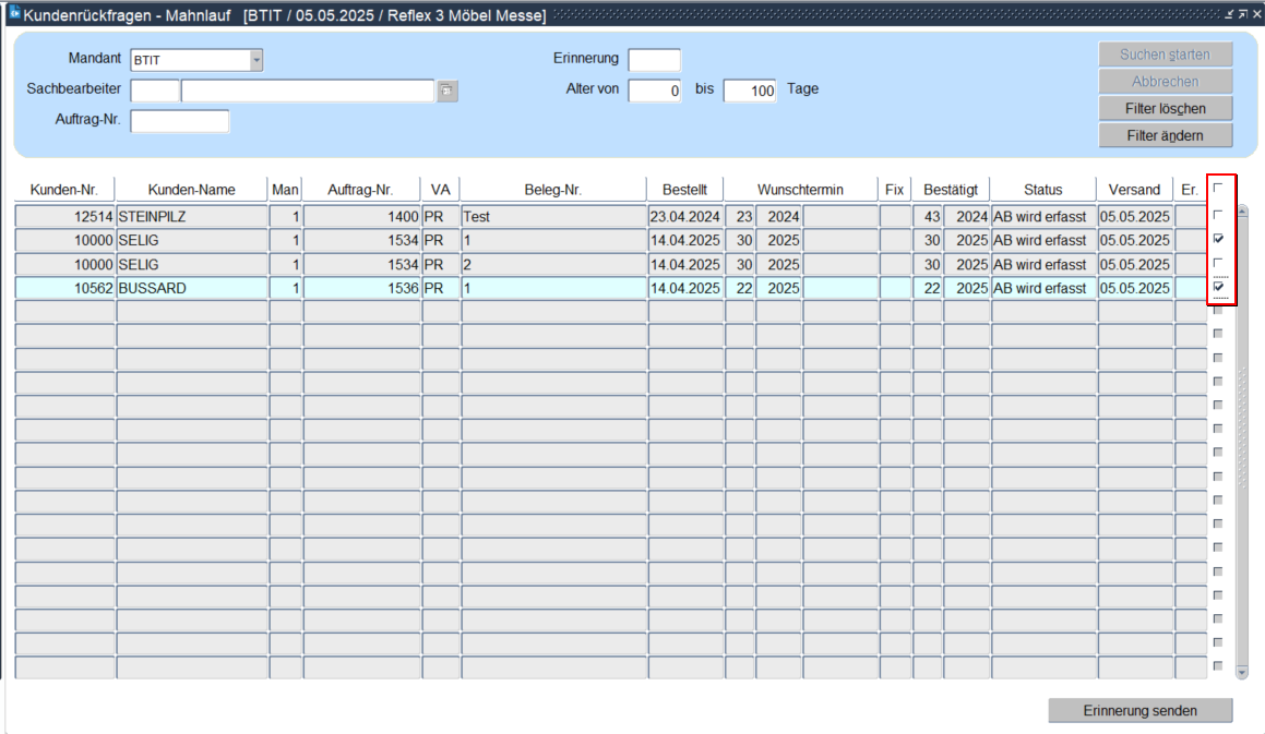 Ein Mahnlauf von offenen Kundenrückfragen kann über diese Form gestartet werden. Hier können alle offenen Rückfragen nach „Mandant“ und/oder „Sachbearbeiter“ (des Auftrages) und/oder „Alter von x bis x Tage“ selektiert werden. Die Einschränkung eines einzelnen Auftrages bzw. Rückfragestati (alle Rückfragen ohne Erinnerung = 0, Rückfragen mit einer Erinnerung = 1, Rückfragen mit zwei Erinnerungen = 2 usw.) ist ebenfalls möglich. Mit dem Aktivieren einzelner Kontrollkästchen bzw. aller Kontrollkästchen und anschließendem Klicken des Buttons „Erinnerung senden“ werden die markierten Rückfragen nochmal versendet wobei der Titel um den Hinweis der jeweiligen Erinnerung erweitert wird.