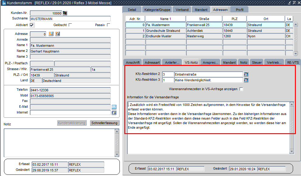 Für die zusätzlichen Informationen im Bereich Restriktionen, die in der Versandanfrage benötigt werden, wurden diese Felder in der Kundenadresse aufgenommen. Diese ergänzt die Standard-KFZ-Restriktion.