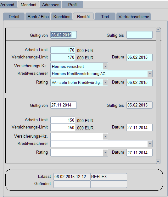 Die Versicherungs- und Arbeitslimitdaten werden in dieser Maske mit einem Gültigkeitsdatum gespeichert und verwaltet.