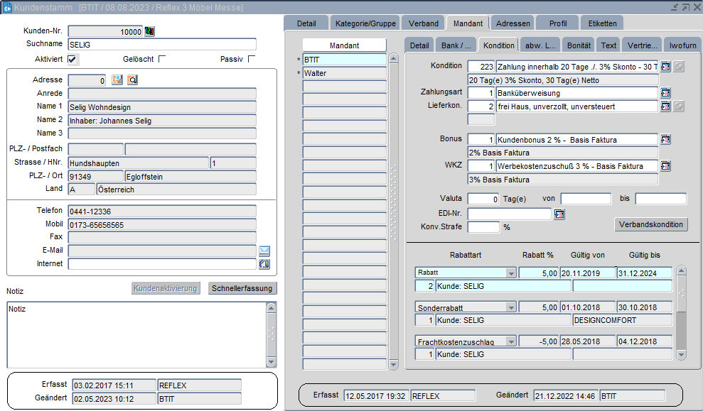 Hier werden die Kundenkonditionen festgelegt. Die meisten Felder werden in der Auftragserfassung als Vorbelegung übernommen und können je Auftrag verändert werden.
