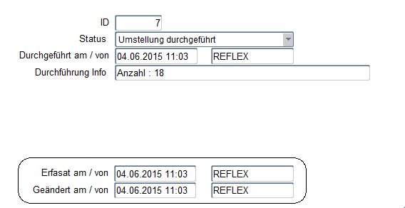Datum und Uhrzeit der Umstellung sowie Name des Anwenders, der den Vorgang durchgeführt hat.
