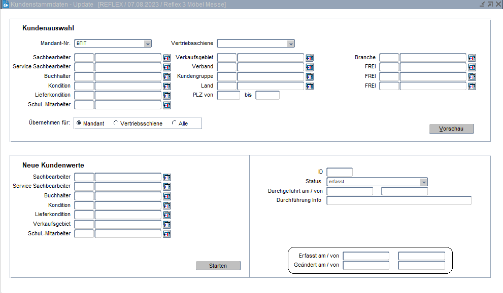 Sollen die Kundenstammdaten eines Postleitzahlenbereichs verändert werden, so werden hier die entsprechenden Werte eingegeben.