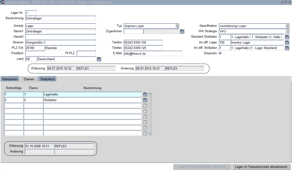 Für die Stellplatzverwaltung müssen hier die verschiedenen Lagerebenen des Lagers benannt werden. Erst wenn alle Lagerebenen für dieses Lager definiert wurden, können die Stellplätze zugeordnet werden. Die Ebenen können z. B. bestehen aus Reihe, Regal und Platz und sind vorher als Stammdaten im Menüpunkt Lagerebenen zu erfassen, falls diese noch nicht vorhanden sind.