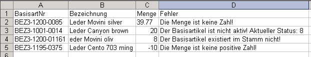Während es Lagevorgangs werden die folgenden Prüfungen durchgeführt. Bei Fehlern werden diese in der Fehlerdatei in der letzten Spalte mit einem Fehlertext ausgegeben.