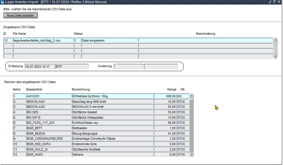 Mit der Anwendung „Lager Inventur Import“ können Zähllisten aus einer Inventur eingelesen werden.