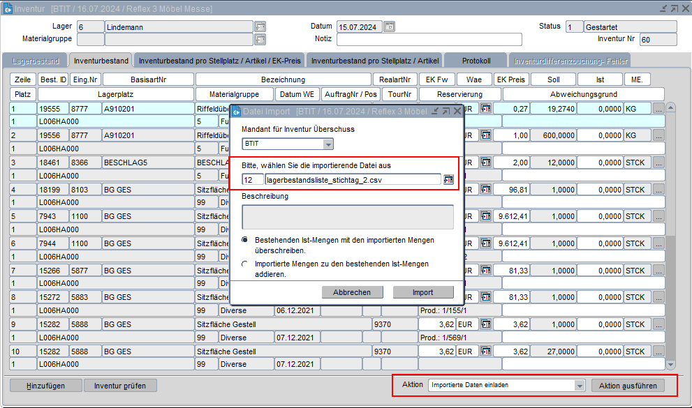 In der Form "Inventur" können nach Inventurstart über die Aktion "Importierte Daten einladen" die Inventurmengen in die entsprechende Inventur geladen werden.