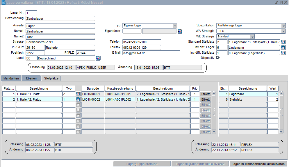 Die Läger können über einen oder mehrere Stellplätze verfügen, die Lagerstruktur wird pro Lager frei definiert. Die Definition der zum Lager gehörigen Stellplätze findet in dieser Registerkarte statt. Damit barcodebasierte Lagerbuchungen (Bestandsbewegung, Inventur) vorgenommen werden können, kann für jeden Stellplatz ein eindeutiger Barcode gespeichert werden.