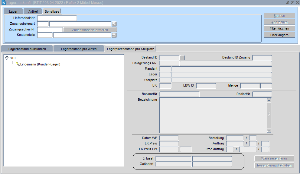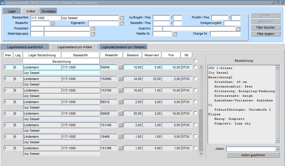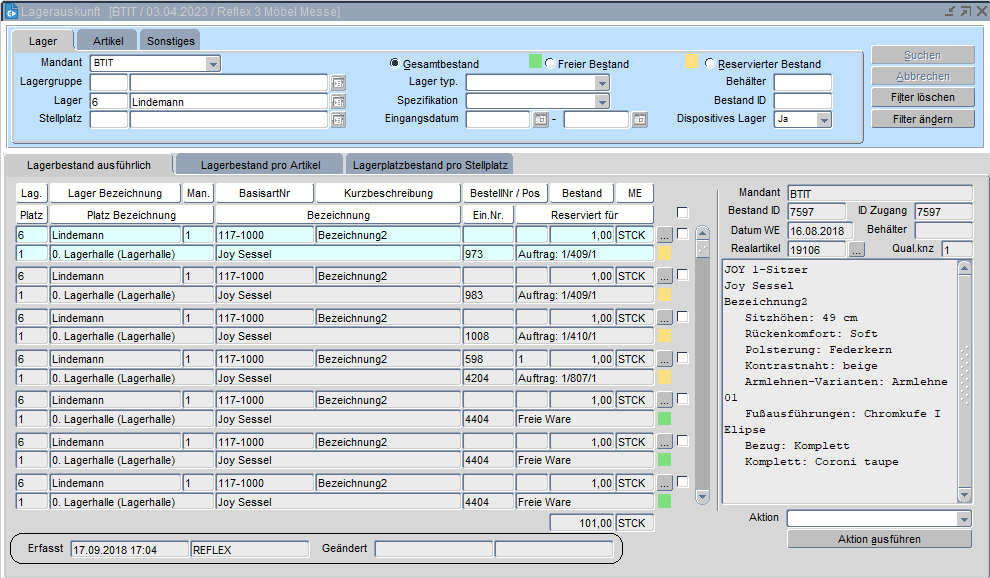 Die Lagerauskunft gibt ausführliche Daten des freien und reservierten Lagerbestandes von Artikeln sowie den genauen Lagerstellplatz bekannt. Mithilfe einer Schaltfläche ist der Wechsel in die Stellplatzauskunft möglich. In der Registerkarte "Lagerbestand" können verschiedene Aktionen wie z. B. die Reservierung von freier Lagerware, das Freigeben von Reservierungen etc. über den Schalter unten rechts ausgeführt werden.