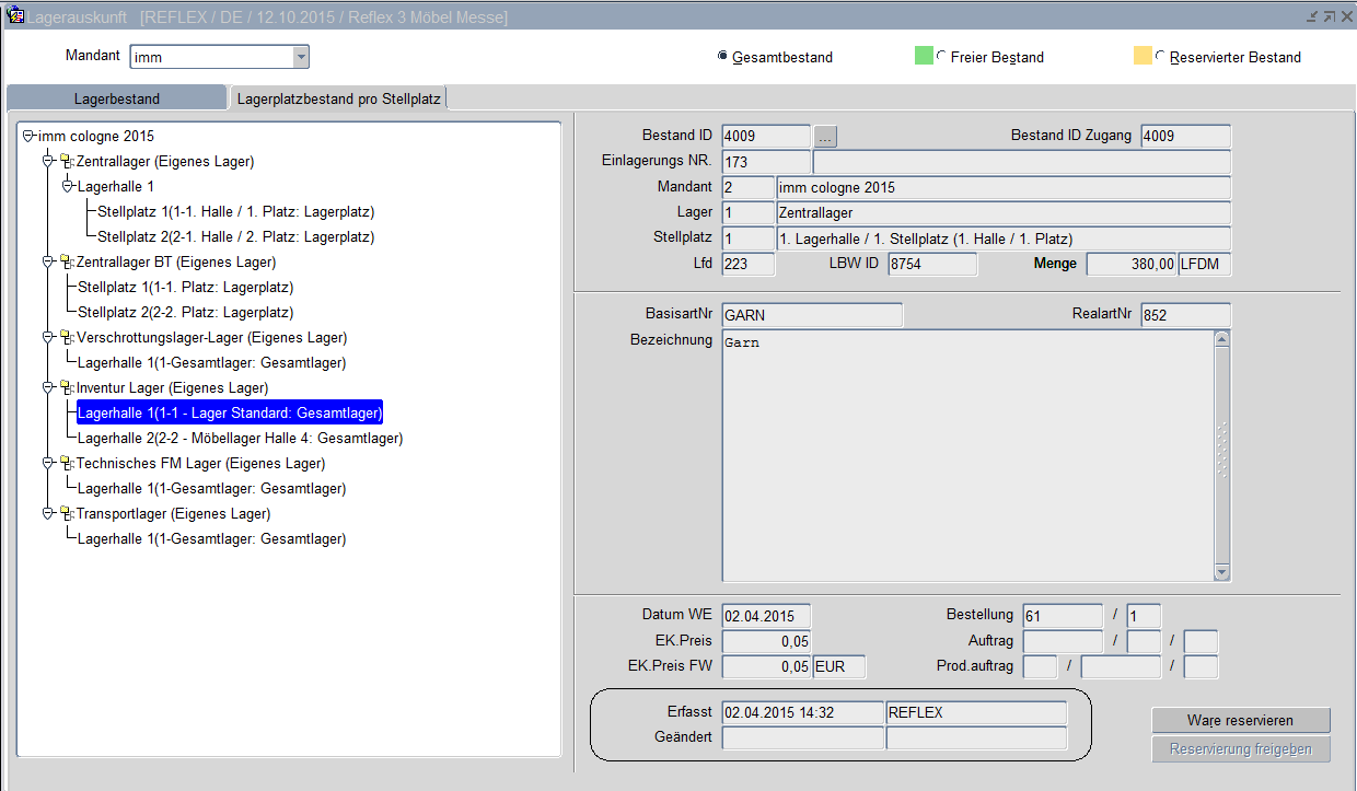 Eingelagerte Ware kann sich an verschiedenen Stellplätzen befinden. Die Übersicht über alle Läger und Lagerplätze sowie die detaillierte Auskunft über den eigentlichen Lagerplatzbestand pro Stellplatz ist in dieser Maske ersichtlich. In dieser Registerkarte können die Aktionen "Reservierung von freier Lagerware" und das "Freigeben von Reservierungen" ausgeführt werden.