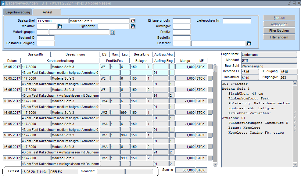 Die Form Lagerbewegungen gibt detaillierte Auskunft über jede Warenbewegung. Mithilfe einer Schaltfläche ist der Wechsel in die Form Bewegungsanzeige möglich.