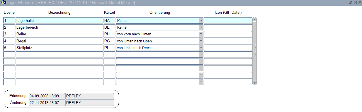 Für die Stellplatzverwaltung müssen hier die verschiedenen Lagerebenen des Lagers benannt werden. Erst wenn alle Lagerebenen für dieses Lager definiert wurden, können die Stellplätze zugeordnet werden. Die Ebenen können z. B. bestehen aus Reihe, Regal und Platz und sind vorher als Stammdaten im Menüpunkt Lagerebenen zu erfassen, falls diese noch nicht vorhanden sind.