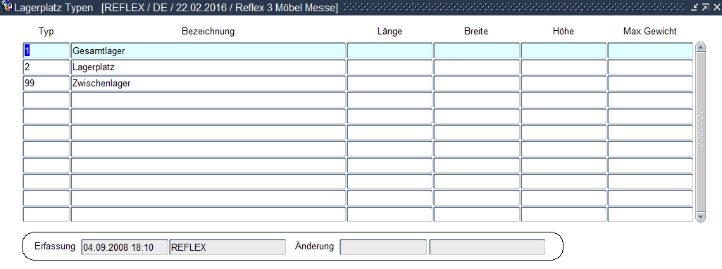 Die Stellplatzstammdaten können mit einem Lagerplatztypen zusätzlich definiert werden, um die Verwaltung der Stellplätze zu vereinfachen. Hier sind die Länge, Breite, Höhe und das zulässige Maximalgewicht des Lagerplatztypen beschrieben.