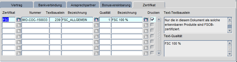 Durch die Eingabe des FSC-Lizensierungscode wird festgelegt, dass der Lieferant FSC-zertifizierte Waren im Sortiment haben kann. Wenn die FSC-Zertifizierung pro Lieferant verwaltet wird, muss hier zusätzlich die Qualität für alle Artikel des Lieferanten angegeben werden.
