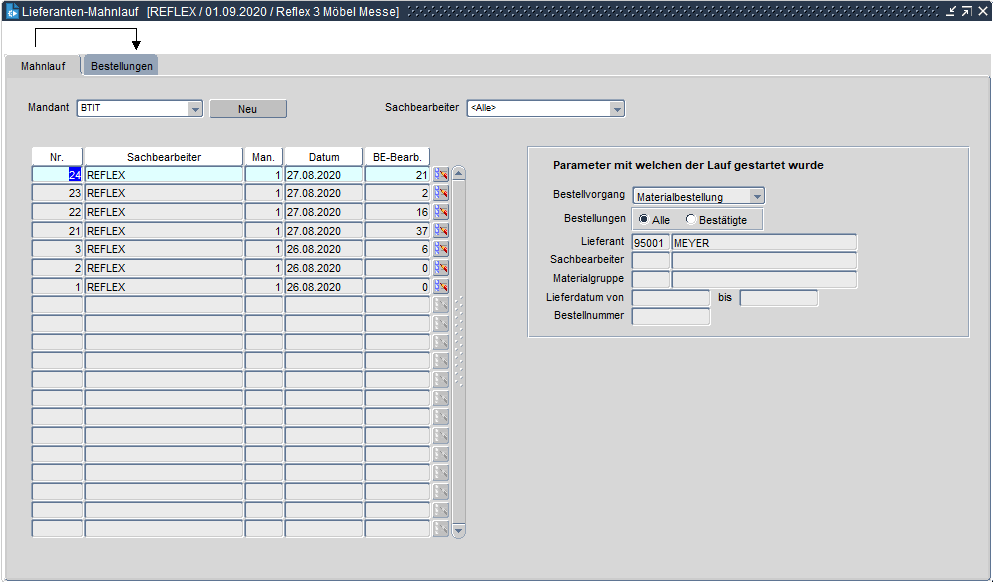 Im rechten Bereich wird angezeigt, mit welchen Parametern der Lieferanten-Mahnlauf gestartet wurde. Ist der Lieferant im Lieferantenstamm für den Mahnlauf aktiviert und einzelne Bestellungen des Lieferanten sollen nicht angemahnt werden, so muss die Bestellung storniert oder der gewünschte / bestätigte Liefertermin geändert werden.