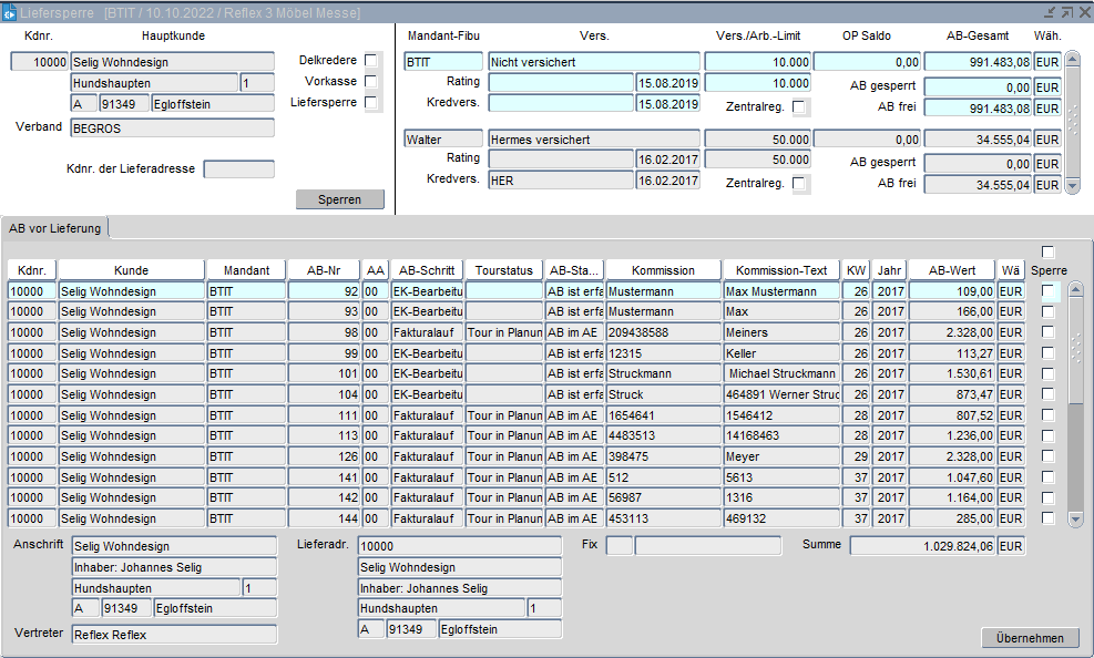 Kennzeichen, ob für den Kunden eine Liefersperre besteht. Dieses Kennzeichen kann für den Kunden und auch für alle Aufträge, die sich noch vor der Auslieferung befinden, über den Button "Sperren" gesetzt werden.