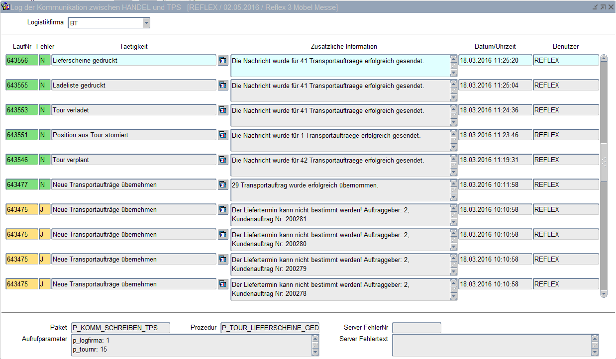 Da die Logistik ein eigenständiger Bereich im Reflexsystem darstellt, müssen die Daten zwischen den Handel und der Logistik übergeben werden. Hier kann es zu Unstimmigkeiten kommen, wenn bestimmte Werte nicht vorhanden sind. Grün gekennzeichnete Transportaufträge sind ohne Fehler an die Logistik übergeben worden. Orange Positionen beinhalten Fehler, die im Feld "Zusätzliche Information" beschrieben sind.