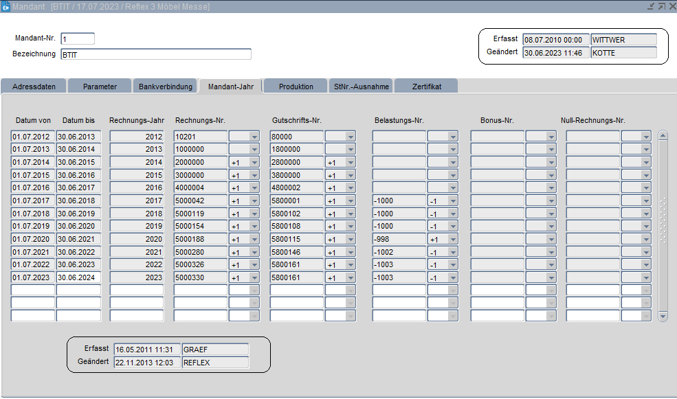Nach einmaliger Erfassung dürfen die Daten nur noch am Anfang des Geschäftsjahres um das aktuelle Jahr erweitert werden. Die zuletzt vergebenen Nummern werden vom System automatisch lt. dem nachfolgenden Wert des Feldes Schrittweite aktualisiert. Achtung, wurde am Anfang eines Jahres keine neue Rechnungs-Nr. eingefügt, kann nicht fakturiert werden. Dieser Eintrag sollte jedoch erst getätigt werden, wenn alle Belege für das alte Geschäftsjahr fakturiert wurden. Nach Eintrag eines neuen Geschäftsjahres können keine Rechnungen, Gutschriften, Belastungen oder Null-Rechnungen mehr für das alte Geschäftsjahr erstellt werden. Das überschreiben der Werte ist nach dem ersten Fakturalauf des aktuellen Geschäftsjahres nicht mehr möglich.