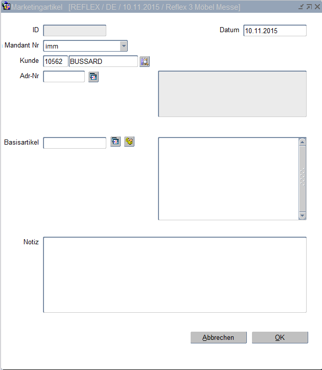 In dieser Maske können dem Kunden Marketingartikel zugeordnet werden.