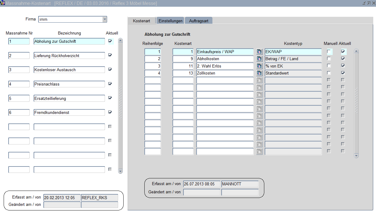 Es gibt verschiedene Kostenarten, die einmalig vorab im Menüpunkt Kostenarten definiert werden müssen. Zusätzlich gibt es Kostenarten, die manuell im Reklamationsvorgang erfasst werden. Zu jeder Maßnahme werden dann die Kostenarten zugeordnet. So besteht die Möglichkeit die Kosten der verschiedenen Maßnahmen zu einem Reklamationsvorgang zu vergleichen. Außerdem können hier die möglichen Auftrags-/ Gutschriftsarten zugeordnet werden.
