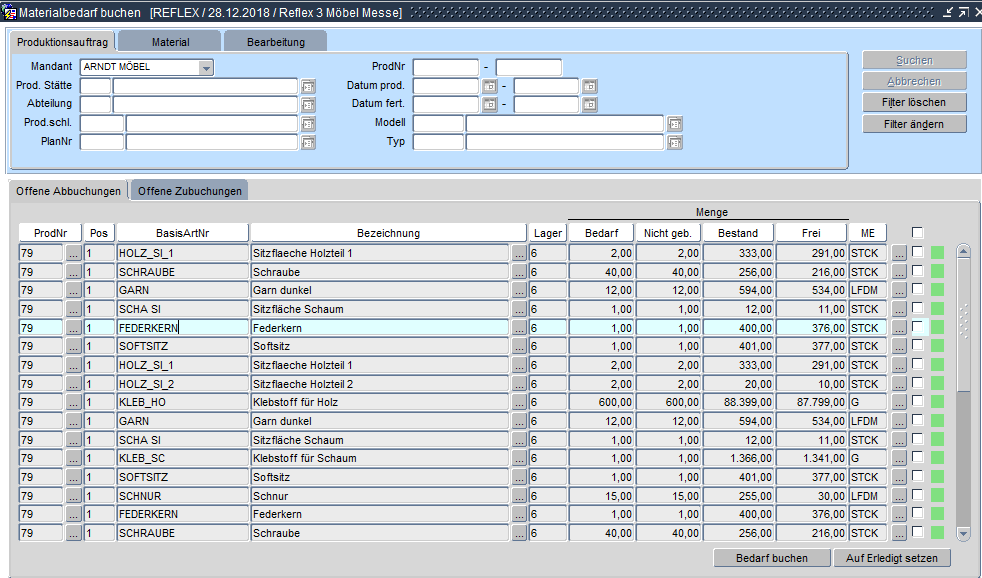 ProduktionMaterialbereitstellungMaterialbedarf buchen Materialbedarf buchen - Filter Produktionsauftrag Materialbedarfe buchen – Filter Produktionsauftrag Über den Filter Produktionsauftrag können die fehlenden Materialabbuchungen mithilfe von produktionsspezifischen oder artikelspezifischen Daten gesucht werden.