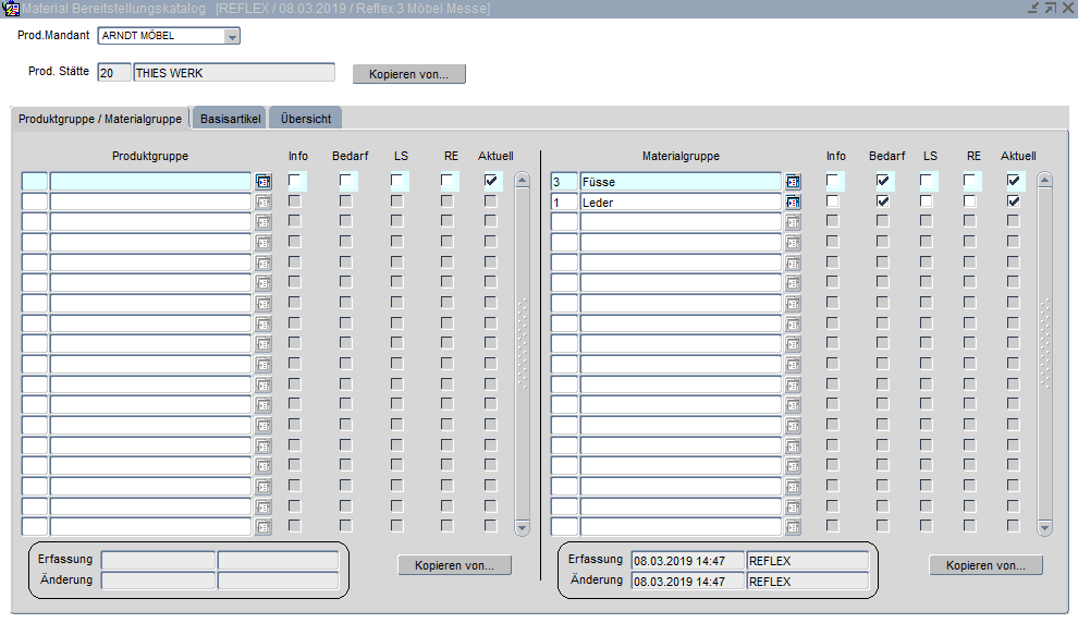Hierfür stehen die gleichlautenden Registerkarten zur Verfügung. Nach Erfassung des Produktionsmandanten und der Produktionsstätte können Produktgruppen, Materialgruppen und/oder die Basisartikel erfasst werden.