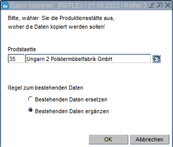 Mit dieser Funktion besteht die Möglichkeit, die Beizustellenden Basisartikel von einer anderen Produktionsstätte zu kopieren. Dabei kann man wählen, ob evtl. bereits erfasste Basisartikel ergänzt oder ersetzt werden sollen.