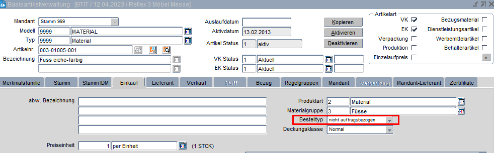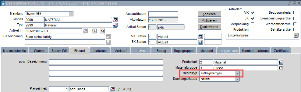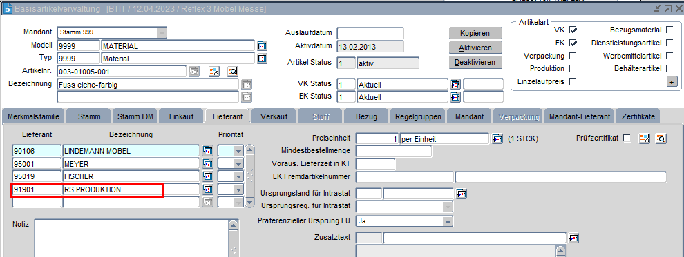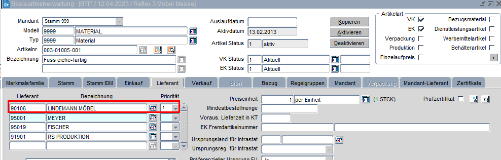 Das Material wird ganz normal wie bisher im Auftrag erfasst. Durch die Hinterlegung des Lieferwerks in der Registerkarte Lieferant mit der Priorität 1 im Basisartikelstamm (siehe Screen) wird dieser bereits in der Dispo für die Produktion vorgeschlagen.