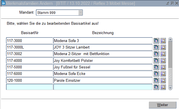 In der Form „Mehrere Merkmalsfamilien ändern“ besteht die Möglichkeit, mehrere Merkmalsfamilien gleichzeitig anzupassen. Für die Selektion der Daten enthält die Form eine Suchmaske der zu bearbeitenden Basisartikel, die mit dem rechten Button aufgerufen werden kann. Für das Hinzufügen einzelner Artikel kann die Werteliste verwendet werden. Sinnvoll ist diese Art der Änderung, wenn für viele Artikel gleichzeitig z. B. ein neues Merkmal aufgenommen werden muss.