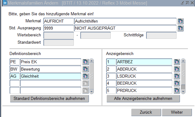 Bei der Wahl eines neuen Merkmals müssen die Standard-Ausprägung sowie Definitionsbereiche und Anzeigenbereiche angegeben werden.