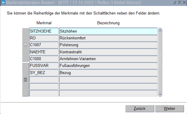Über die Pfeiltasten kann die Reihenfolge der verschiedenen Merkmale angepasst werden.