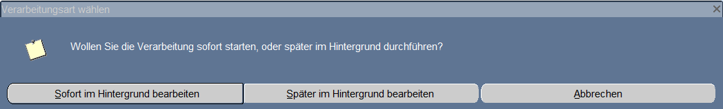 Nach erfolgter Eingabe und Klicken des Buttons "Weiter" erscheint die Abfrage, ob die Verarbeitung sofort oder später im Hintergrund bearbeitet werden soll. Handelt es um sehr viele Artikel, so ist eine spätere Verarbeitung im Hintergrund angebracht.
