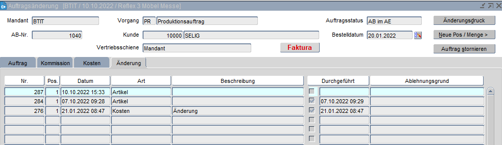 Werden die Änderungen genehmigt, so sind die geänderten Daten in der Auftragserfassung sichtbar. Bis dahin erscheinen sie in der Tabelle in der Registerkarte "Auftragsänderungen".