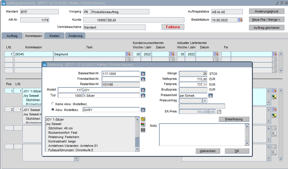 Muss die abweichende Modellbezeichnung in einem Auftrag mit dem Status „AB in AE“ gewählt bzw. verändert werden, so kann dieses ebenfalls über die „Meldepflichtige Auftragsänderung“ geschehen. Nach der Bestätigung der abweichenden Modellbezeichnung findet wie bei bei der Änderung eines Artikels eine erneute Preisfindung statt. Bei Bedarf kann eine Notiz zur Änderung erfasst werden, mit OK wird die Änderung übernommen. Die Notiz zur Artikeländerung wird in der Änderungsanfrage angezeigt.