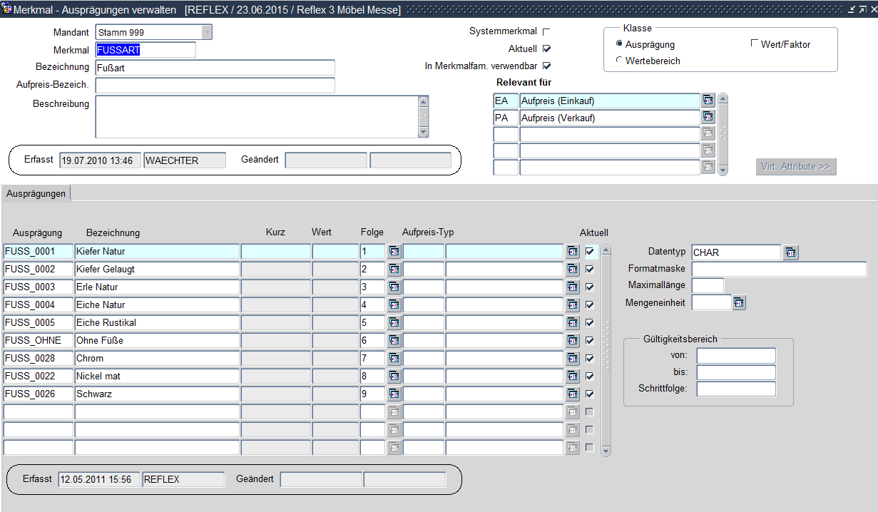 Der Verkaufsartikel wird beim Verkauf und Einkauf durch Wahl des Basisartikels und Wahl der für diesen Basisartikel möglichen Merkmalsausprägungen, Bezugskombinationen und Stoffe gebildet. In dieser Form werden die Merkmale gespeichert und die entsprechenden Ausprägungen zugeordnet. Ein Merkmal könnte z. B. "Fußart" heißen, die entsprechenden Ausprägungen wären dann z. B. Kiefer natur, Kiefer gelaugt, Eiche natur.....Die Daten können jederzeit vervollständigt werden.