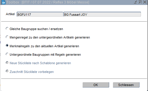 Es kann vorkommen, dass in den Stücklisten die Merkmale der übergeordneten und untergeordneten Baugruppe unterschiedlich sind. In diesen Fällen müssen die einzelnen Merkmal-Ausprägungen mit Merkmalregeln verknüpft werden. Das bedeutet, dass pro Merkmal, so viel Regeln, wie Ausprägungen unter dem Merkmal existieren. Diese Funktion ermöglicht es in einem Vorgang sehr viele Merkmalregel zu generieren. Ein wichtiger Vorteil dabei ist, dass alle Kombinationen automatisch generiert werden können und damit die Gefahr einer fehlenden Kombination ausgeschlossen ist.