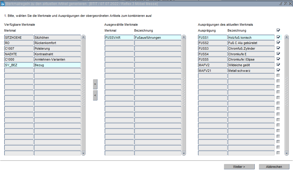 In dem ersten Schritt wird das Merkmal bzw. die Merkmalkombination (also mehrere Merkmale) der übergeordneten Baugruppe ausgewählt werden, welche auf der Bedingung-Seite der generierenden Regeln stehen soll. In der Auflistung auf der linken Seite stehen alle verfügbaren Merkmale der übergeordneten Baugruppe. Mit dem Button „>“ können die Merkmale ausgewählt werden. Die ausgewählten Merkmale erscheinen in dem mittleren Block, die dazugehörigen Ausprägungen erscheinen rechts im Fenster. Das Kontrollkästchen der Ausprägungen sind standardmäßig markiert. Mit dem Button „Weiter“ generiert das Programm jede mögliche Kombination der ausgewählten Merkmal-Ausprägung und springt zum nächsten Schritt weiter.
