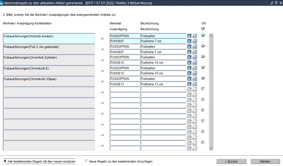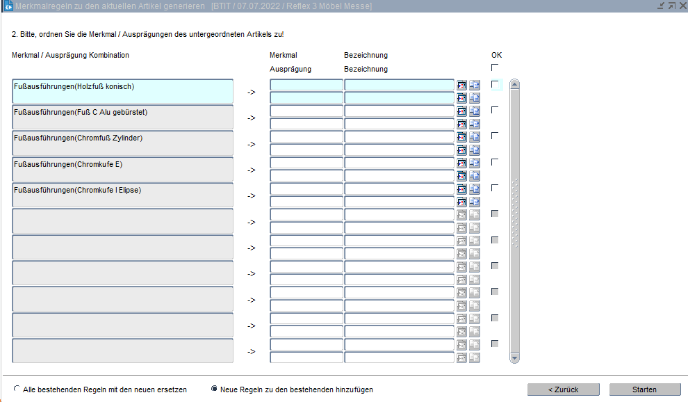 Als nächstes müssen die Merkmal-Ausprägungen des untergeordneten Artikels zugeordnet werden.