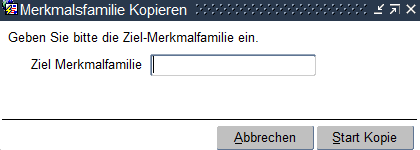 Merkmalsfamilien können wie Basisartikel ebenfalls kopiert werden. Die zu kopierende Merkmalsfamilie wird selektiert. Mit dem Button „Kopieren" wird ein weiteres Fenster geöffnet, in dem die Ziel-Nummer eingegeben wird. Über den Button „Start-Kopie" wird die Kopie der Merkmalsfamilie erstellt. Das System wechselt zur neuen Merkmalsfamilie, der Status steht auf „in Bearbeitung".