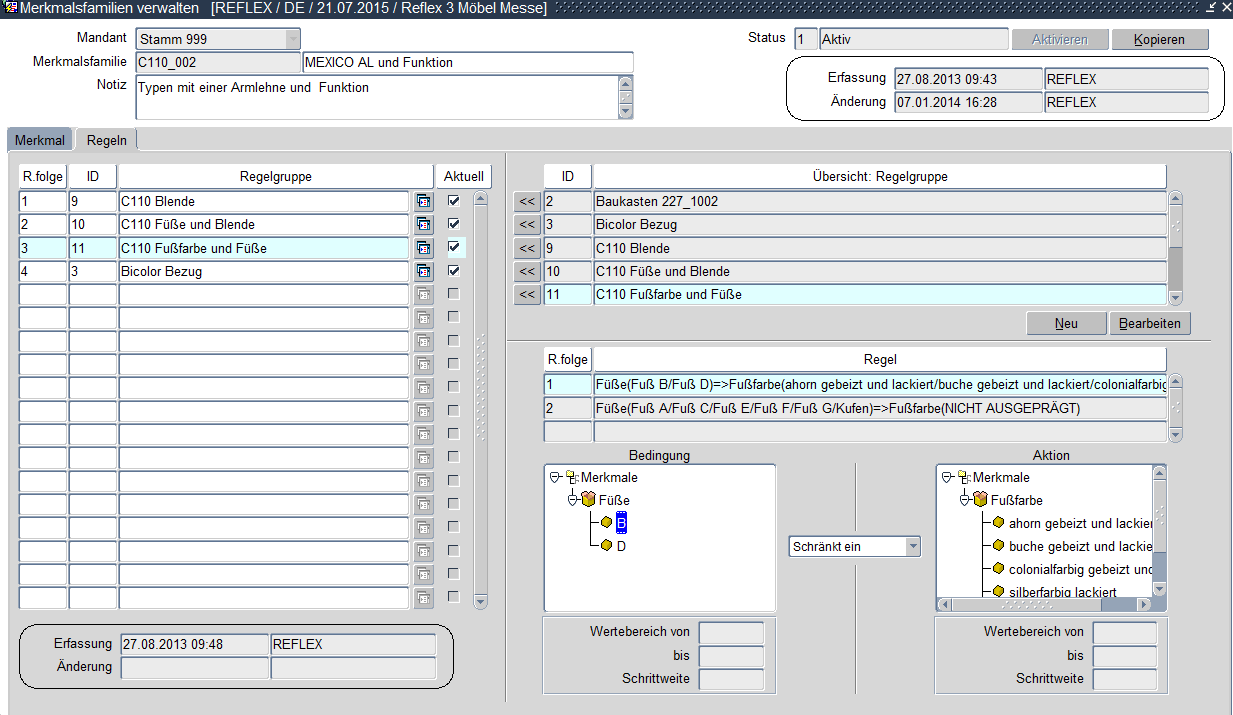 Die Regeln der Merkmalsfamilien können bei einer bestimmten Merkmalsausprägung eine andere Merkmalsausprägung derselben Merkmalsfamilie bestimmen oder ausschließen. Es könnten hierüber die entsprechenden Leisten zu den Füßen oder die Art und Anzahl der Kissen gesteuert werden. (Beispiel: Bedingung – Merkmal Fußart = „Holz, Holz mit Rollen, Holz mit Teppichrollen" schränkt ein – Aktion – Merkmal Fußfarbe = „Kirschbaum, Nussbaum, Nussbaum-antik, Buche-natur, Erle" usw.) Auf der rechten Seite erscheinen nur die Regelgruppen, die auch für die aktuelle Merkmalsfamilie geeignet sind. Die Regelwerkgruppen können über die Werteliste, über die Eingabe der ID oder über die Pfeiltasten der entsprechenden Regelgruppe auf der rechten Seite zugeordnet werden. Neue Regelwerke werden über die Schaltfläche "NEU" definiert.