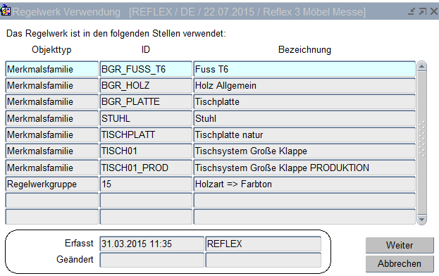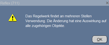 Beim Ändern "Button Bearbeiten" eines Regelwerks prüft das Programm, ob das Regelwerk bereits irgendwo benutzt wird – in diesem Falle erscheint nochmals eine entsprechende Meldung mit einem Hinweis. Durch die Bestätigung mit „OK" erscheint ebenfalls die Maske mit der "Regelwerk Verwendung". Mit dem Button "Weiter" wird dann die Maske "Merkmalregeln erfassen" zum Bearbeiten geöffnet.
