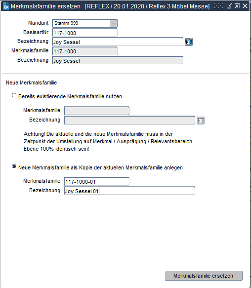 Wurde die entsprechende Option gewählt, kann über den Button "Merkmalsfamilie ersetzen" die aktuelle Merkmalsfamilie mit der neuen Merkmalsfamilie ersetzt werden.