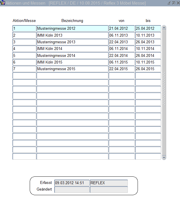 In dieser Maske werden die Messe- und Aktions-Stammdaten verwaltet. Es können für Messen und Aktionen besondere Preise hinterlegt werden. Hierbei stehen dann die Messen und Aktionen als Werteliste zur Verfügung.