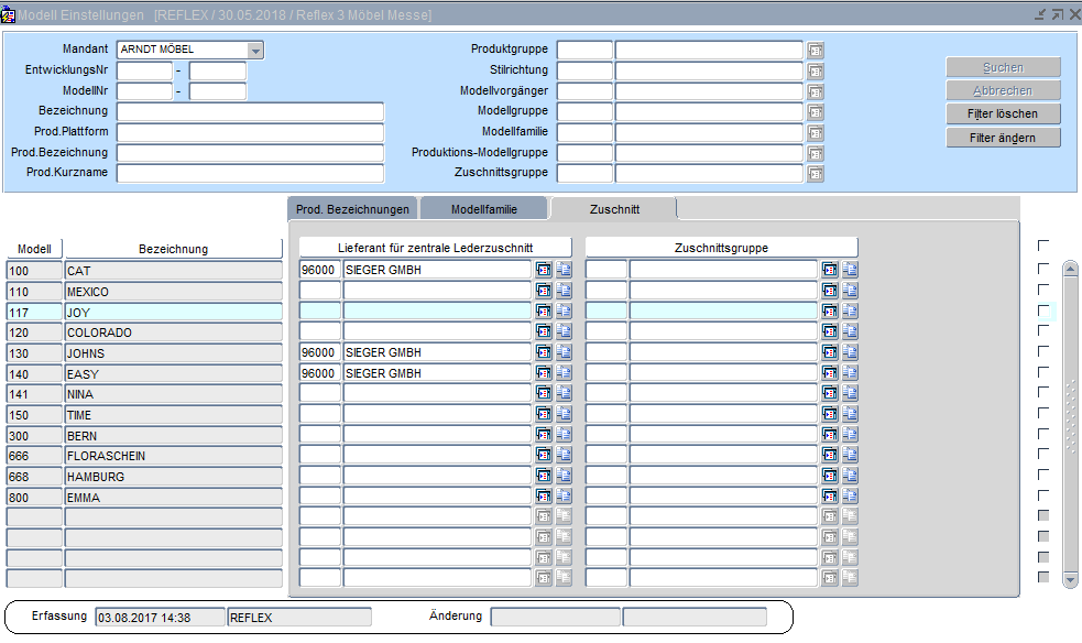 Je Modell können an dieser Stelle die Lieferanten für zentrale Lederzuschnitte hinterlegt werden. Außerdem wird an dieser Stelle die Zuschnittgruppe festgelegt.
