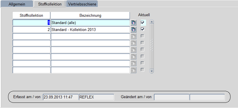 Nummer der Stoffkollektion. Die Kollektion muss bereits im Menüpunkt Stoffkollektion gespeichert sein. Eine Werteliste über [F9] ist verfügbar.