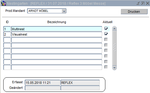 ProduktionStammdaten Nestingarten Nestingarten Die möglichen Nestingarten werden in dieser Maske erstellt. Die Zuordnung der Nestingart zum Bezugsstoff wird in dem Menüpunkt "Basisartikel Einstellungen" vorgenommen.