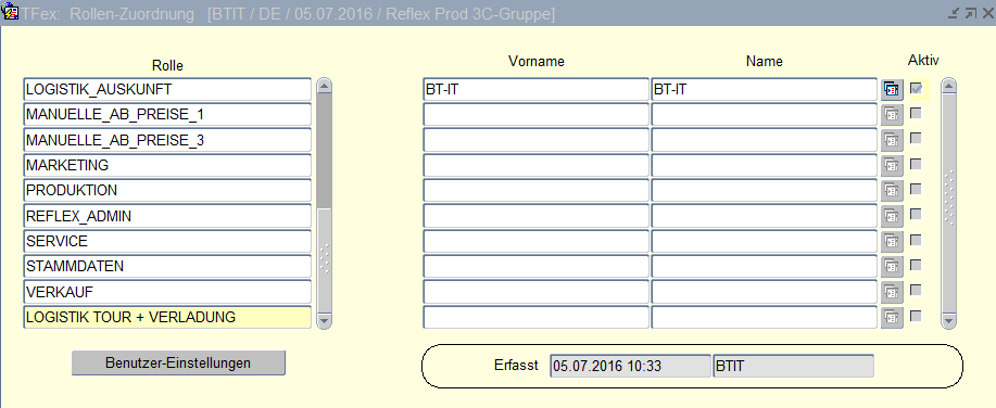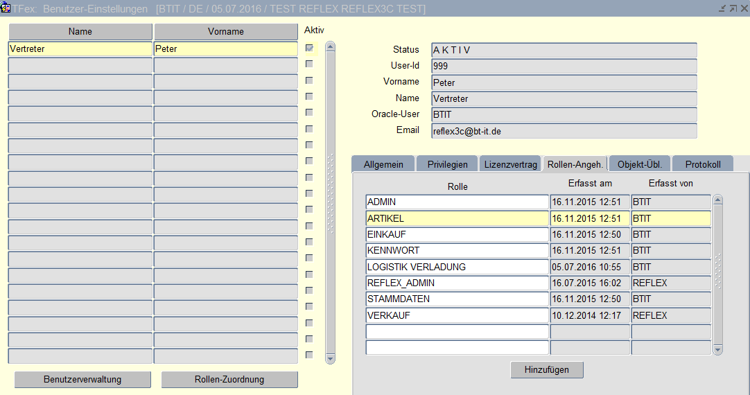 Mit einem Klick der rechten Maustaste auf dem TFex-Menü wird das Kontextmenü geöffnet. Hier wählt man den Menüpunkt "Rollen-Zuordnung". Mit der Taste F6 kann auf der linken Seite der Maske eine neue Rolle hinzugefügt werden. Es muss mindestens ein User für die Rolle gespeichert werden.