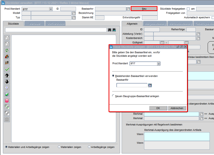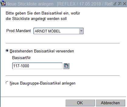 Mit dem Button "Neu" in der "Form Stücklisten verwalten" kann eine neue Stückliste für einen bestehenden Basisartikel oder auch für eine Baugruppe erstellt werden. Es wird vom System eine Form geöffnet, in der man zwischen den Optionen "Bestehenden Basisartikel verwenden" (und neue Stückliste hierfür anlegen) und "Neue Baugruppe-Basisartikel anlegen" wählen kann. Nach Auswahl des Mandanten kann ein im Basisartikelstamm bestehender Basisartikel evtl.auch mithilfe der Werteliste ausgewählt werden.