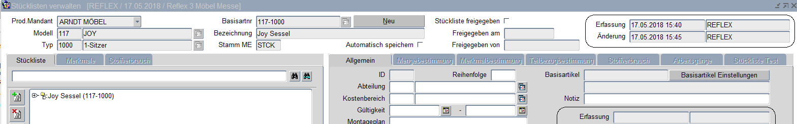 Nach der Bestätigung der Option "Bestehenden Basisartikel verwenden" und OK werden die Grunddaten der Stückliste vom System angelegt und die Form Stückliste verwalten wird wieder angezeigt. Hier können nun Baugruppen, Materialien und Arbeitsgänge über die linke Symbolleiste hinzugefügt werden.